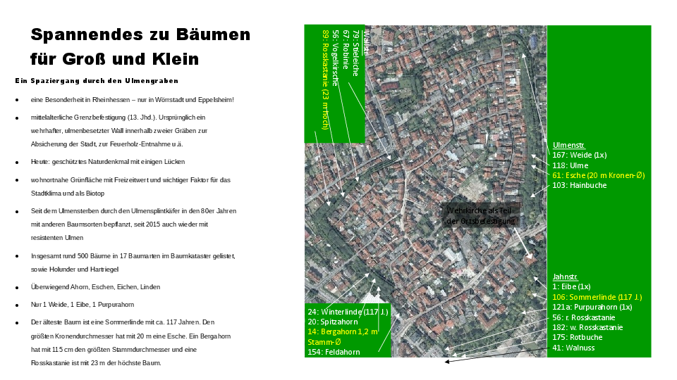 Doch sind alles Ulmen oder lassen sich auch andere Arten finden? Welche Bedeutung haben die Bäume innerhalb dieses Biotops? Welches ist der Älteste, der Höchste der Dickste? Das und vieles mehr soll dieser Rundgang für Kinder und Erwachsene klären.